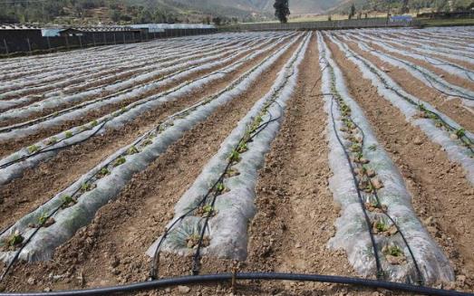 ? ? ? ?(3)膜上灌、膜下灌水肥一體化工程。膜下灌溉施肥一體化系統(tǒng)由潛水電泵、文丘里施肥器、輸水帶、三通、四通、直接、微灌帶組成。微灌帶為黑色塑料軟管帶,每隔20厘米設(shè)2個(gè)并排出水孔,可向行距30-50厘米的兩行作物同時(shí)灌水。輸水帶為黑色塑料軟管帶,帶上不設(shè)出水孔,主要是向微灌帶輸水。